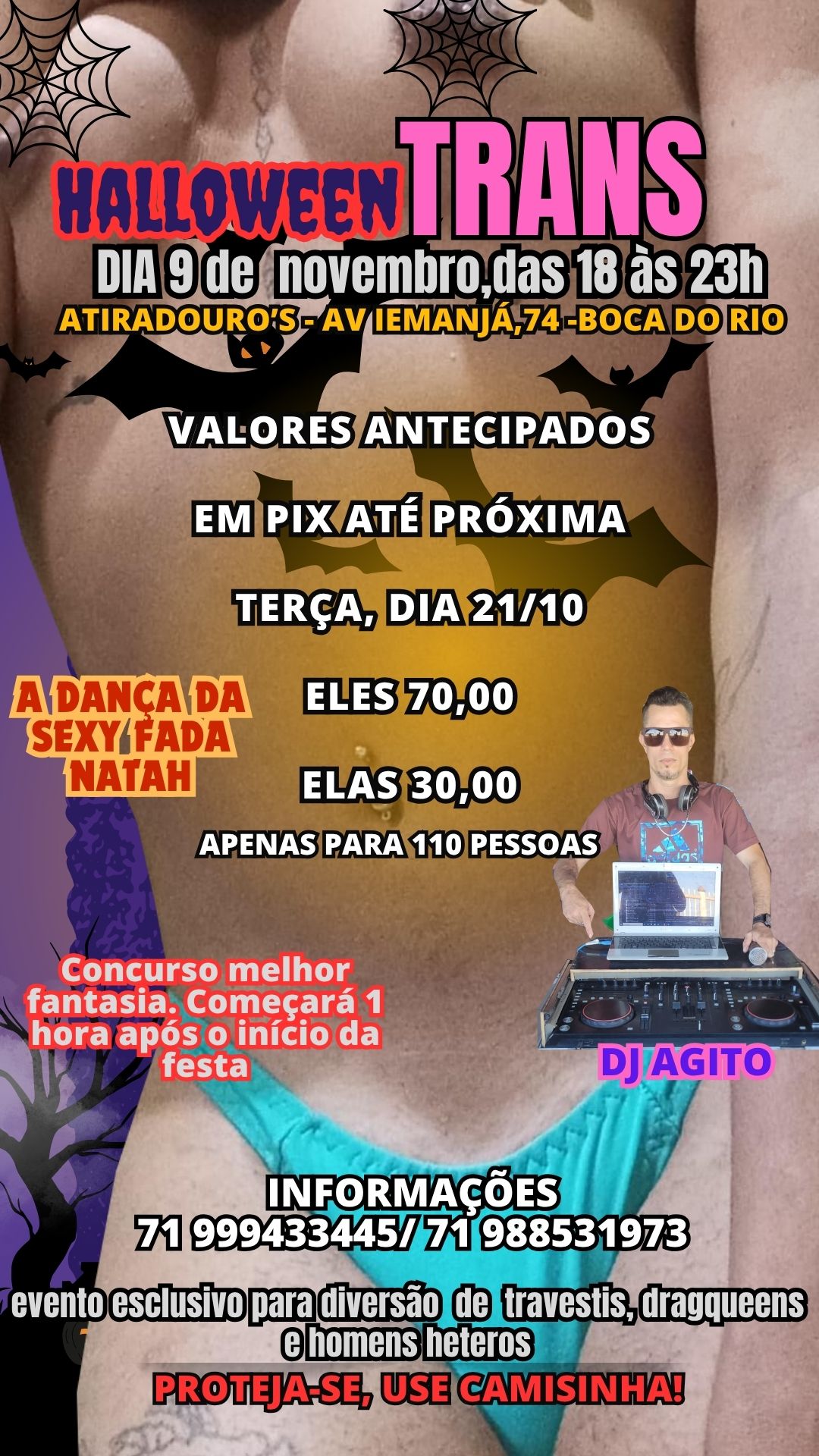 Halloween Trans , dia 9 de novembro, em Salvador, das 18h às 23:30h Muita gente pedindo pra não parar as festas. A equipe produtora então decidiu por fazer uma nova tentativa e como os Halloweens Trans, historicamente, sempre tiveram grande quantidade de público, foi decidido que a equipe fará a festa em novembro: Halloween Trans …